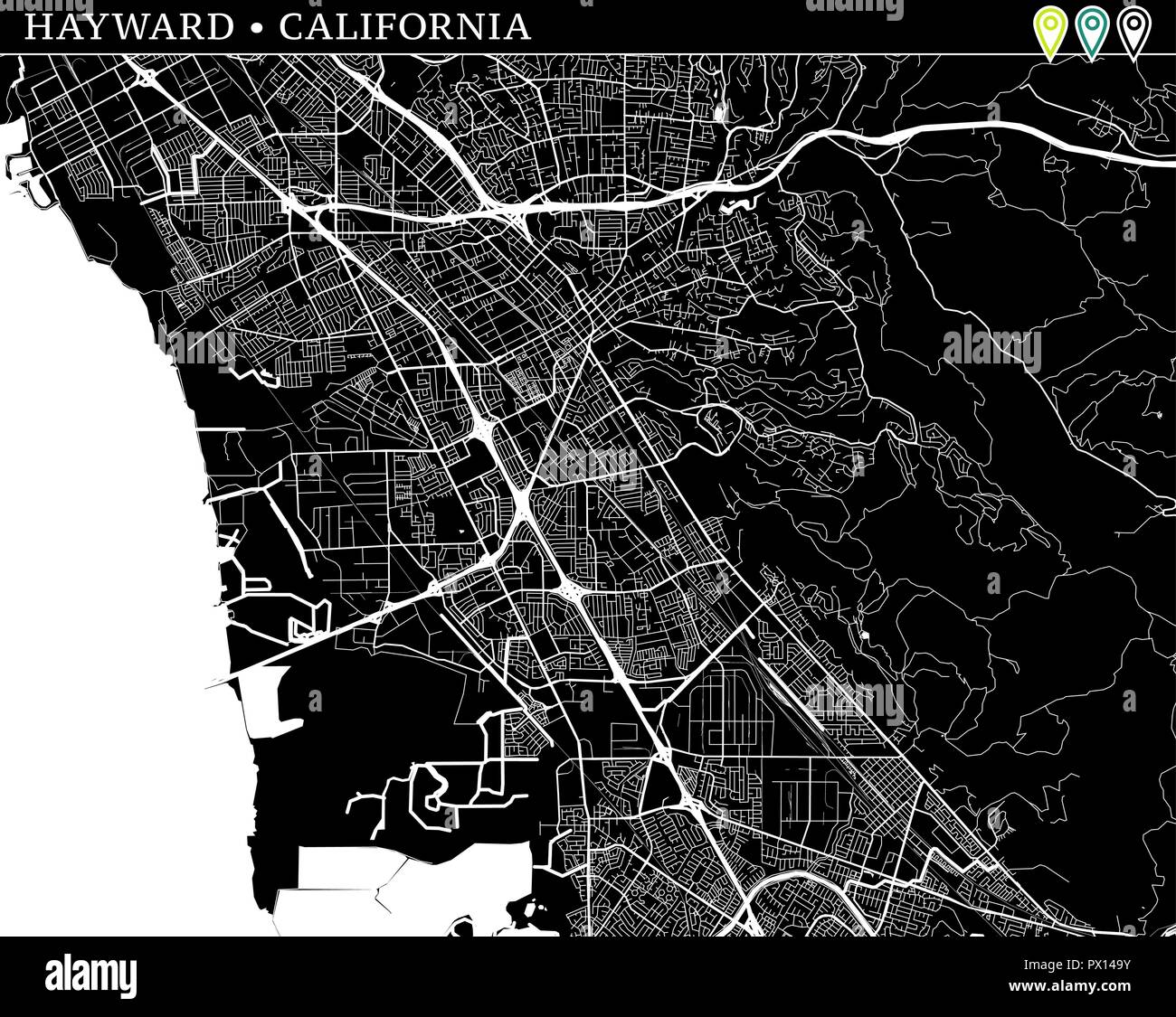 Simple map of Hayward, California, USA. Black and white version