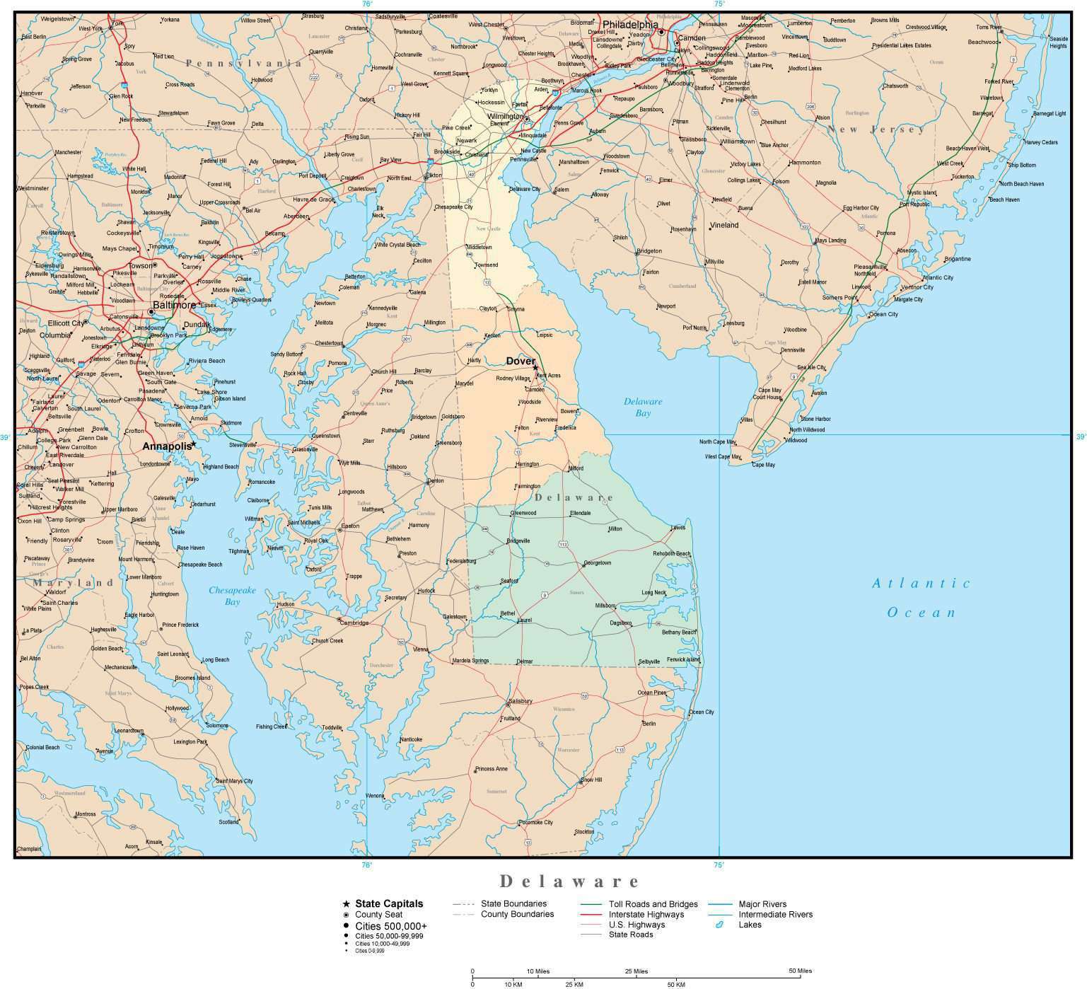 Delaware Adobe Illustrator Map with Counties, Cities, County Seats